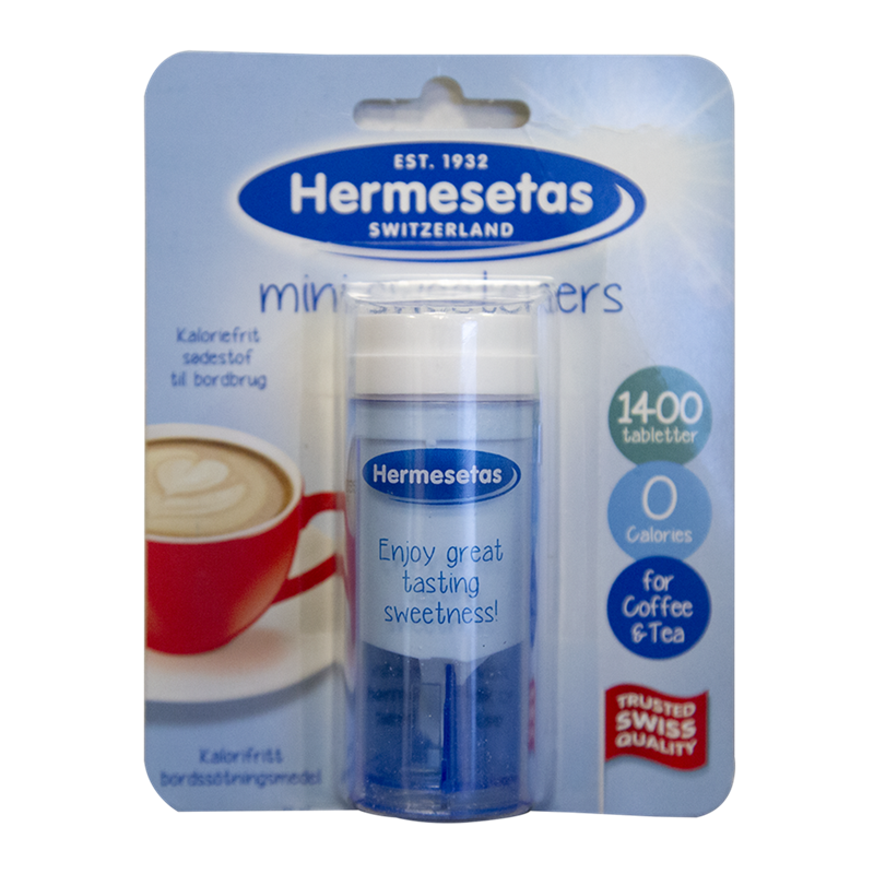 - Hermesetas er et kaloriefrit sødemiddel med en rund smag. Kan anvendes til kage, te, kaffe og andre varme og kolde drikke.