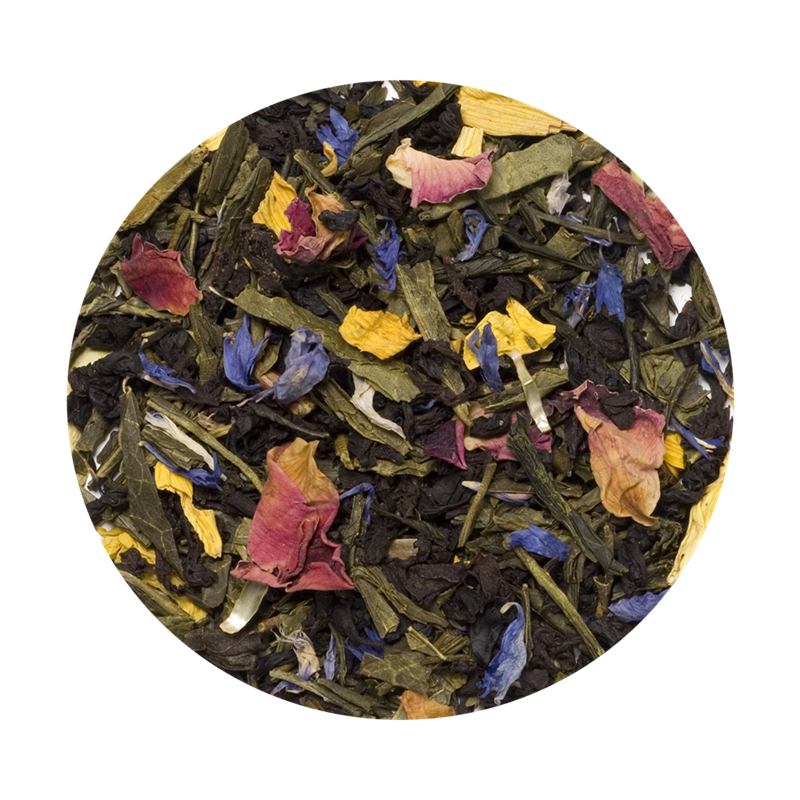 Økologisk grøn te fra Sri Lanka, økologisk sort te fra Sri Lanka, økologiske rosenblade, økologsik morgenfrue, økologisk katost og naturlig aroma
