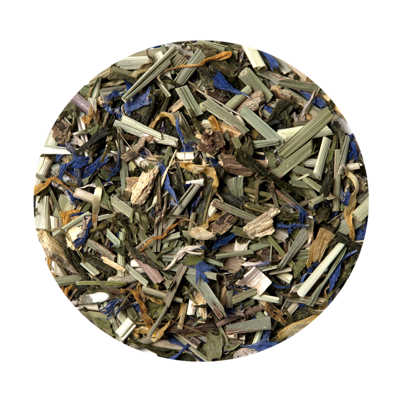 Lakridsrod*(39%), grøn te( 33%), citrongræs*(22%), naturlig aroma(5%),, indeholder kornblomst* og/eller katostblomst*, morgenfrueblomster*. * = økologisk. Indeholder lakrids - personer, der lider af forhøjet blodtryk, bør undgå for stort indtag.